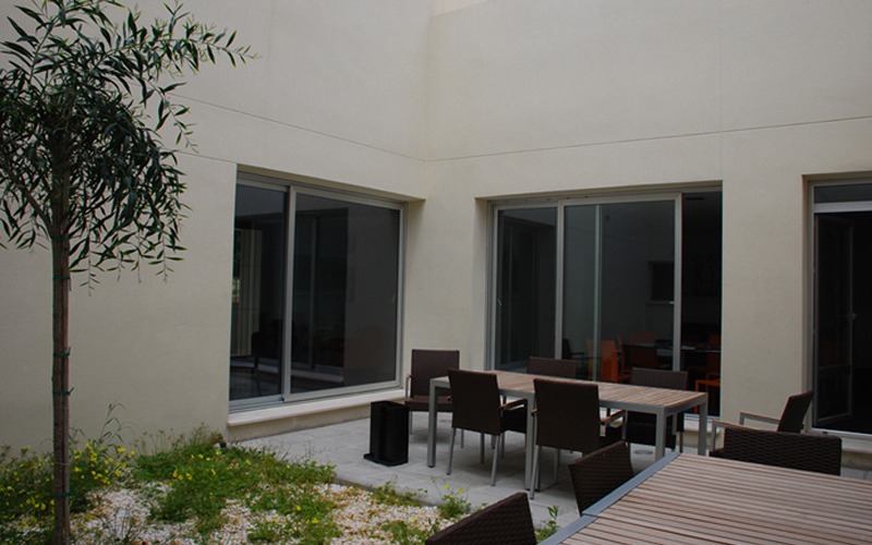 La casa-hogar en planta baja se organiza en torno a dos patios: el primero es un patio ajardinado, en contacto con el hall de entrada, los salones y el comedor se trata de un patio público en contacto con las zonas comunes del edificio y el segundo de carácter más íntimo en contacto con el área privada de las habitaciones.