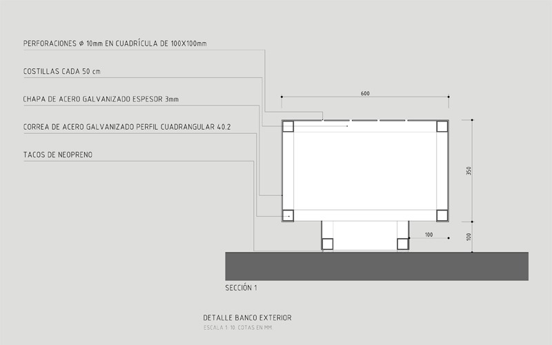 Banco metálico exterior para el Centro de Interpretación de Restos Arqueológicos. San Juan de Aznalfarache.