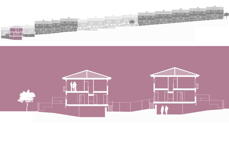 Al no disponer de la primera manzana para conectar el límite urbano con nuestra actuación, la propuesta presenta un frente de fachada en el acceso desde el centro de la población. Por esta razón, en la manzana C se cambia la orientación inducida por la propia urbanización, girándola 90° y consiguiendo una hilera de viviendas apoyada sobre una calle horizontal, que hará de frente al resto de la promoción que se escalona siguiendo la pendiente del terreno.