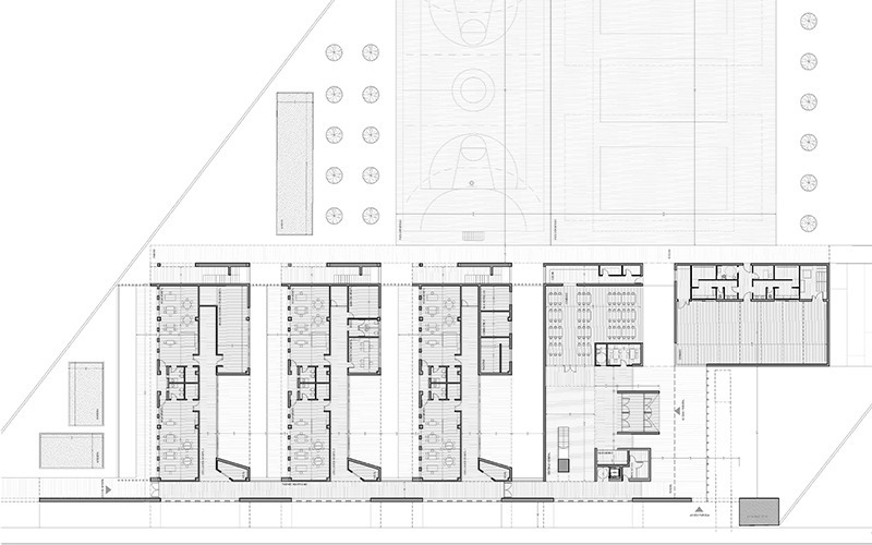 El programa del centro se ha compuesto mediante “bandas de usos” independientes: área de profesorado y personal no docente, educación infantil y educación primaria. Las aulas de infantil se disponen todas en planta baja. El aulario de primaria se distribuye en primera. En la planta baja, en el ámbito de articulación entre el área de infantil y primaria, se han dispuesto los usos comunes para ambos, como el comedor y el de personal no docente.