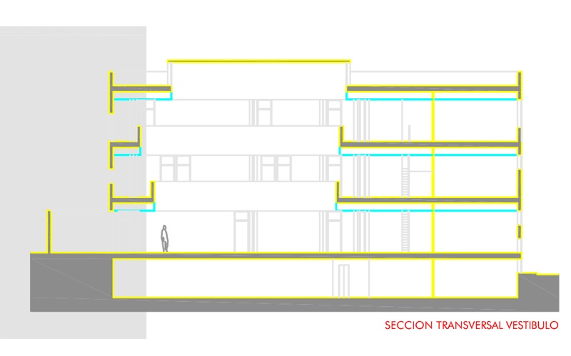 En la parcela existe un fuerte desnivel que permite la entrada al sótano por la calle más baja casi directamente (sin rampa). Usando esta diferencia de cota, se construye un zócalo o basamento sobre el que emerge el edificio.