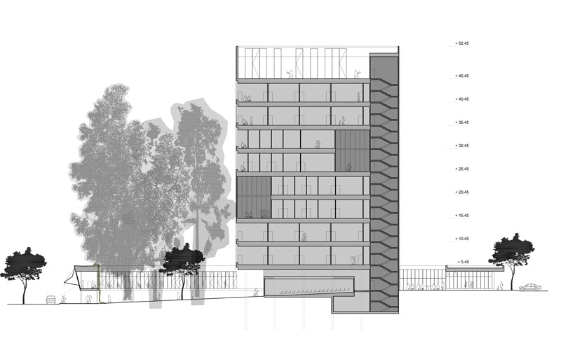 La parcela objeto del proyecto es muy alargada en la dirección perpendicular a la Avenida. El edificio, tal y como impone el Plan General, ocupará toda la parcela a excepción del espacio lateral libre que también impone el Plan.