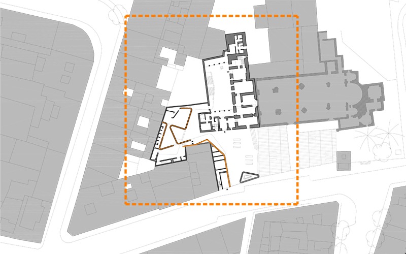 En caso de construir el sótano de aparcamiento bajo la entrada, se construiría un pequeño cuerpo que comunicara desde el compás, directamente con el aparcamiento aislando este espacio de la calle y consiguiendo el mismo efecto que el Hornito de Santa Eulalia situado delante de la Iglesia.