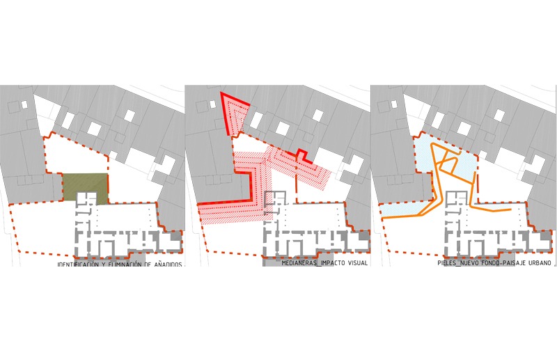También estuvo presente desde la primera visita, la idea de dejar como conjunto unido e interrelacionado el Convento y la Iglesia, liberando espacio, metiendo «Aire» entre este cuerpo principal y la medianera oeste; para finalmente adosar una piel que nos aislara del caótico mundo de las medianeras, conformando un espacio propio donde se emplazarían los espacios más funcionales del uso hotelero.