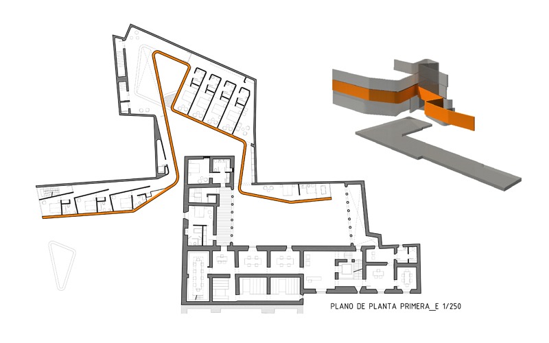 Puesto que el proyecto tiene dos usos fundamentales, el cultural (Centro de Estudios Eulalienses) y de hospedaje, nos pareció también desde el principio, que el centro de estudios debería estar íntegramente en el edificio existente ocupando la parte expositiva la planta baja, y el resto de los usos (biblioteca, archivo, etc.) en lugares más aislados del público en planta primera y segunda.