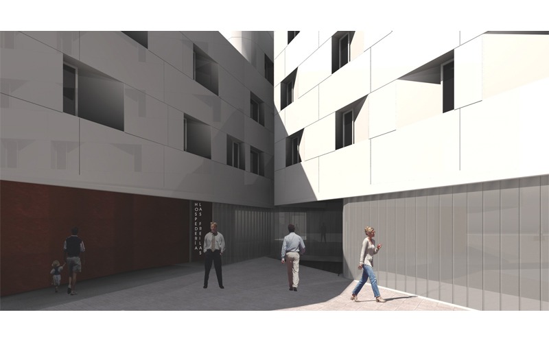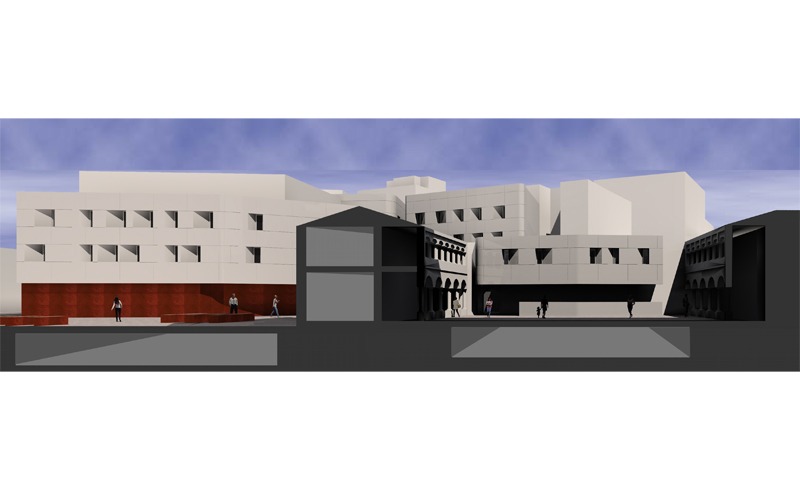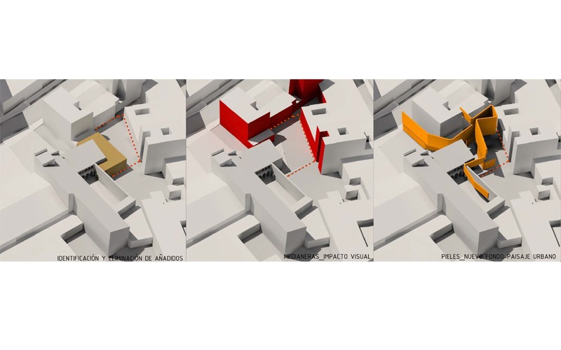 También estuvo presente desde la primera visita, la idea de dejar como conjunto unido e interrelacionado el Convento y la Iglesia, liberando espacio, metiendo «Aire» entre este cuerpo principal y la medianera oeste; para finalmente adosar una piel que nos aislara del caótico mundo de las medianeras, conformando un espacio propio donde se emplazarían los espacios más funcionales del uso hotelero.