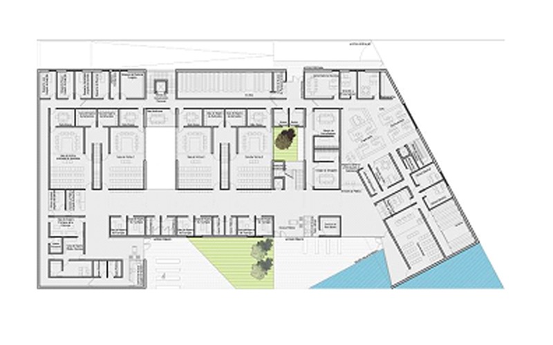 Se estructura en bloques diferenciados, organizados según la naturaleza de cada uso: zonas administrativas, salas judiciales, áreas de archivo y servicios comunes. Entre los bloques se generan patios y espacios libres, garantizando iluminación natural y ventilación.