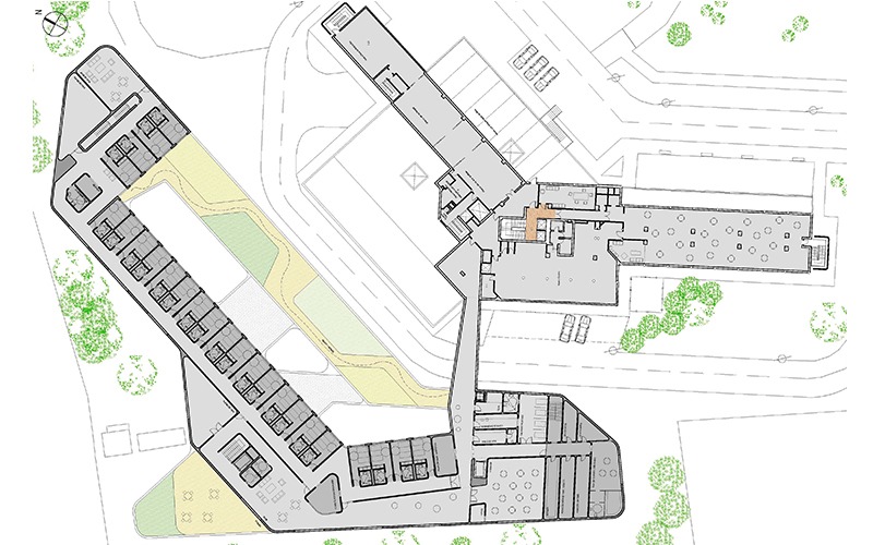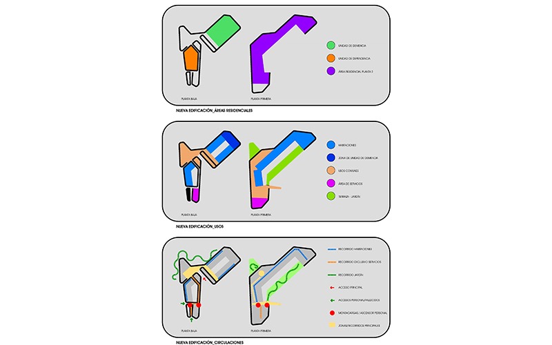 La organización general de la ampliación en planta baja consiste en un acceso central con apeadero entre las áreas de demencia y dependencia que cuentan con sus propios espacios de relación y convivencia, una la zona de servicio en el extremo sur al comienzo de la calle y el área común a continuación del acceso, en el extremo oeste en contacto con las zonas ajardinadas del lindero oeste de la parcela, más íntimas por ser de menor tamaño.