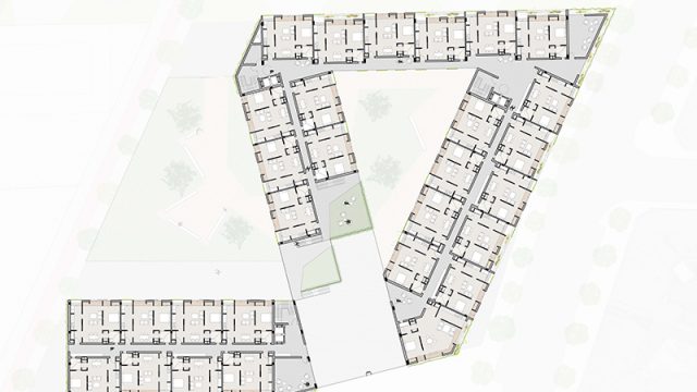 Las plantas superiores albergan alojamientos a dos caras con un pasillo central abierto en sus extremos, que, con retranqueos alternados, genera espacios de acceso a las viviendas en el interior y terrazas con jardineras al exterior.