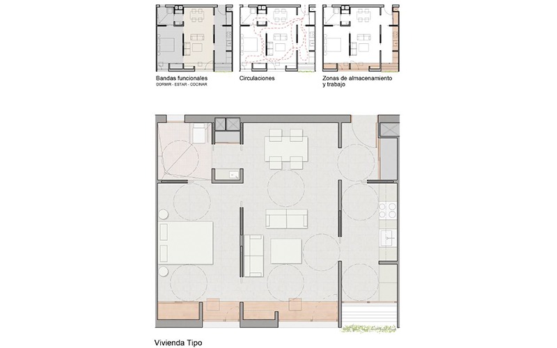 El proyecto tiene como objetivo crear un espacio de convivencia inclusivo para residentes de diversas edades, promoviendo la interacción entre jóvenes, mayores y vecinos del barrio. Los espacios comunes de la planta baja se conciben como una plaza pública abierta al entorno, equipada con cafetería, comedor, lavandería, gimnasio, club social y pequeños locales comerciales, fomentando así la relación y encuentro entre los habitantes.