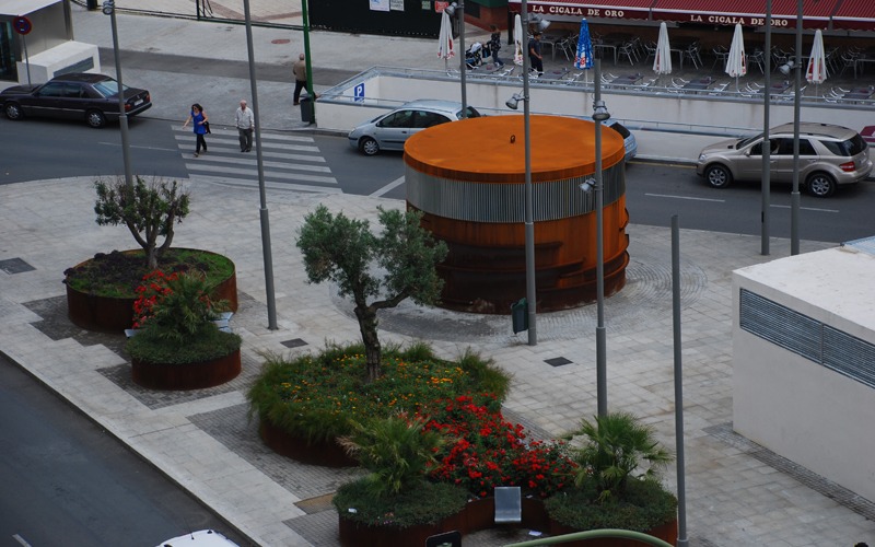 • Se integra también en el diseño de la plaza el paso del carril bici por José Laguillo y las entradas peatonales del parking. Como materiales se usan el acero cortén para el mobiliario de la plaza y el acero inoxidable con vidrio para las entradas peatonales al aparcamiento.