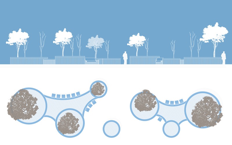 • Recuperación del espacio delimitado por la isleta de tráfico, que es usado como aparcamiento en superficie, como espacio público dotado de zonas de juego, fuentes, vegetación y espacios reservados entre las piezas ajardinadas para bancos que, protegidos por la vegetación, hagan esta plaza un lugar de descanso recogido y grato.