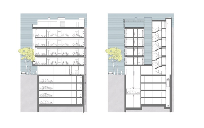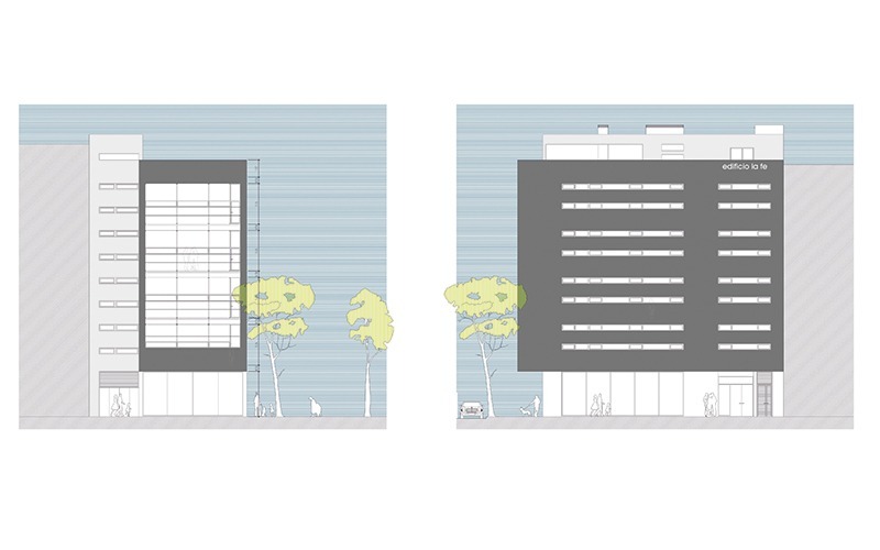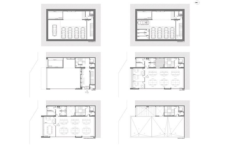 La planta baja albergará el acceso principal por la C/ Nebli, y un local comercial que dará a las dos calles. El acceso de los coches al garaje se realizará por un ascensor de coches situado en la C/ Luis Montoto. Cada planta de garaje tendrá cinco plazas de aparcamiento.