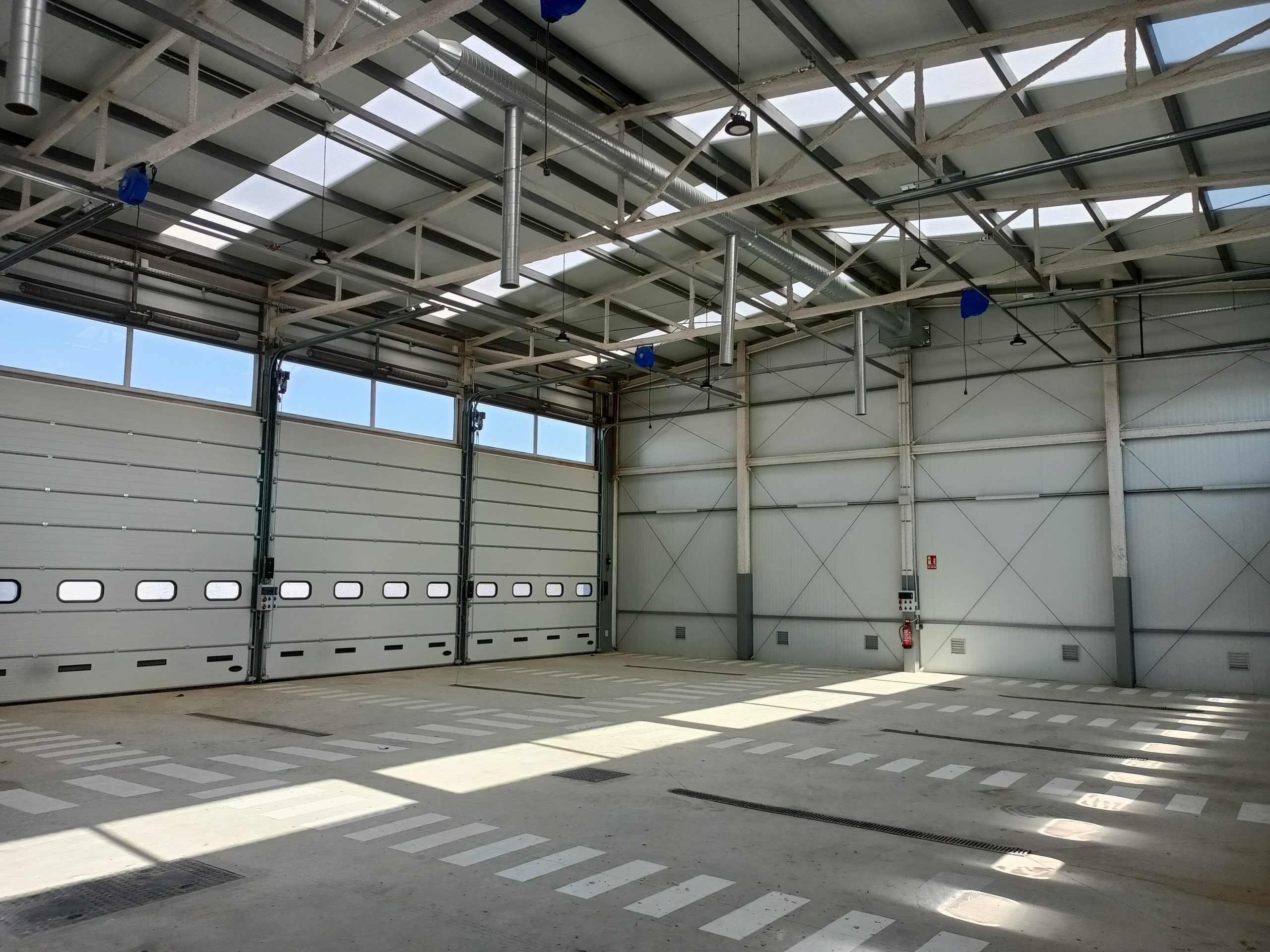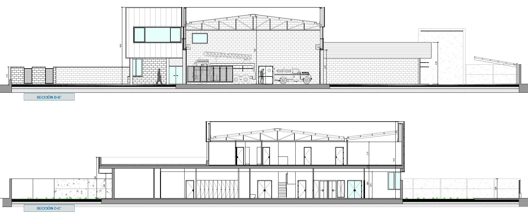Hangar de vehículos: un cuerpo rectangular con cubierta a dos aguas, altura de 9,00 m.