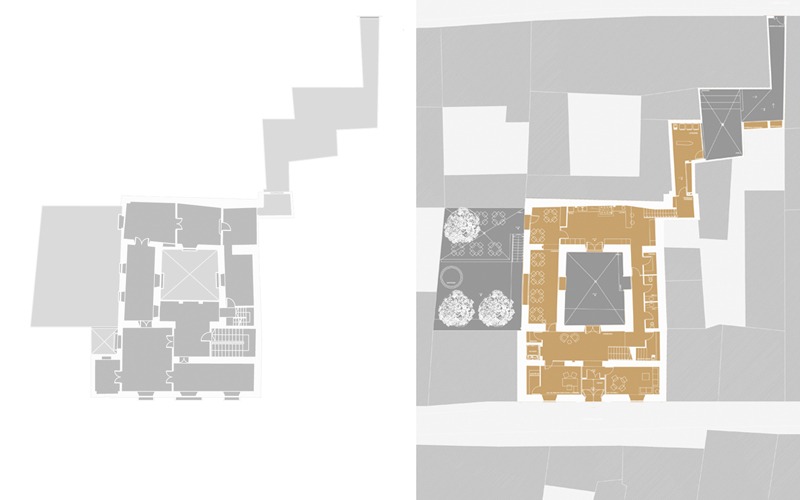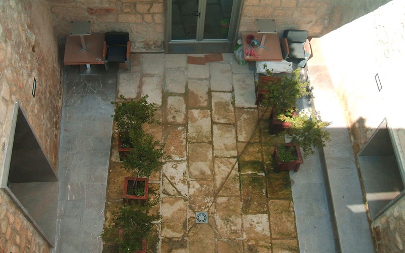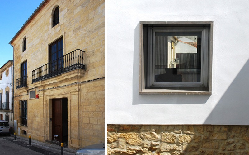 Patios: De los tres patios, el central actúa como núcleo alrededor del cual gravita el edificio, sirviéndose de él la mayor parte de las estancias. El patio lateral se convierte en una extensión de las zonas comunes interiores del edificio, y el patio trasero se utiliza como patio de servicio.