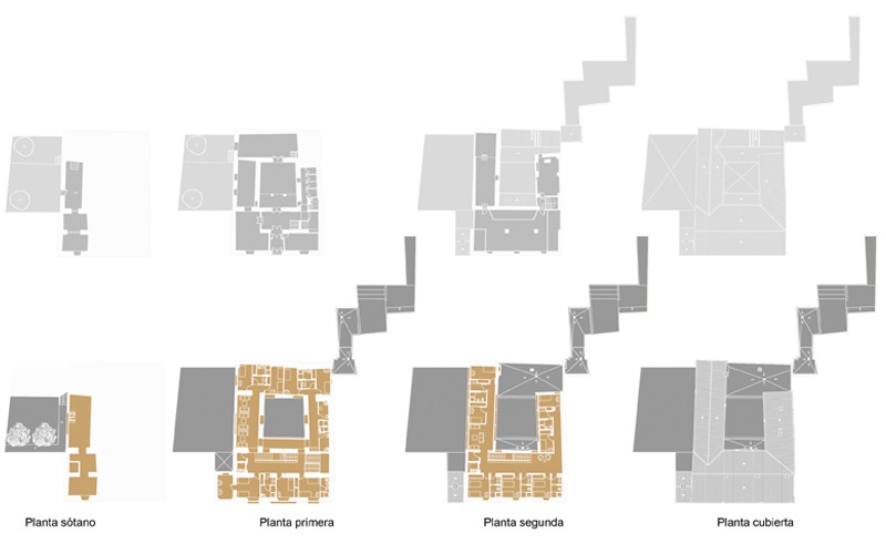 Programa funcional: El programa de la casa-hogar se acomoda en las tres plantas principales del edificio. En planta baja se desarrollan los usos comunes (entrada, sala de estar, comedor, despacho de monitores, sala de atención personalizada, cocina y lavandería). En las plantas primera y segunda se encuentran las habitaciones (dobles o individuales según el caso) con las zonas de circulación alrededor del patio y una sala de estar por planta. El semisótano se utiliza únicamente como almacén.