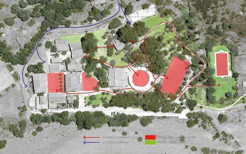 Teniendo en cuenta los recursos disponibles, en principio creemos que sería una bonita actuación aquella que respetara la placita andaluza rectangular, a la que antes nos hemos referido como centro de convivencia, alrededor del cual se encuentran todos los servicios y alojamientos. Dentro del conjunto, nos parecería interesante conservar la placita de toros como salón de actos descubierto, cine de verano, etc., así como la bodega, un salón junto a la plaza y la zona deportiva, demoliendo el resto y dedicando su espacio a jardines de paseo. En esta actuación, aún cuando habría que estudiarla pormenorizadamente, estimamos que se podrían invertir unos 2 millones de euros.