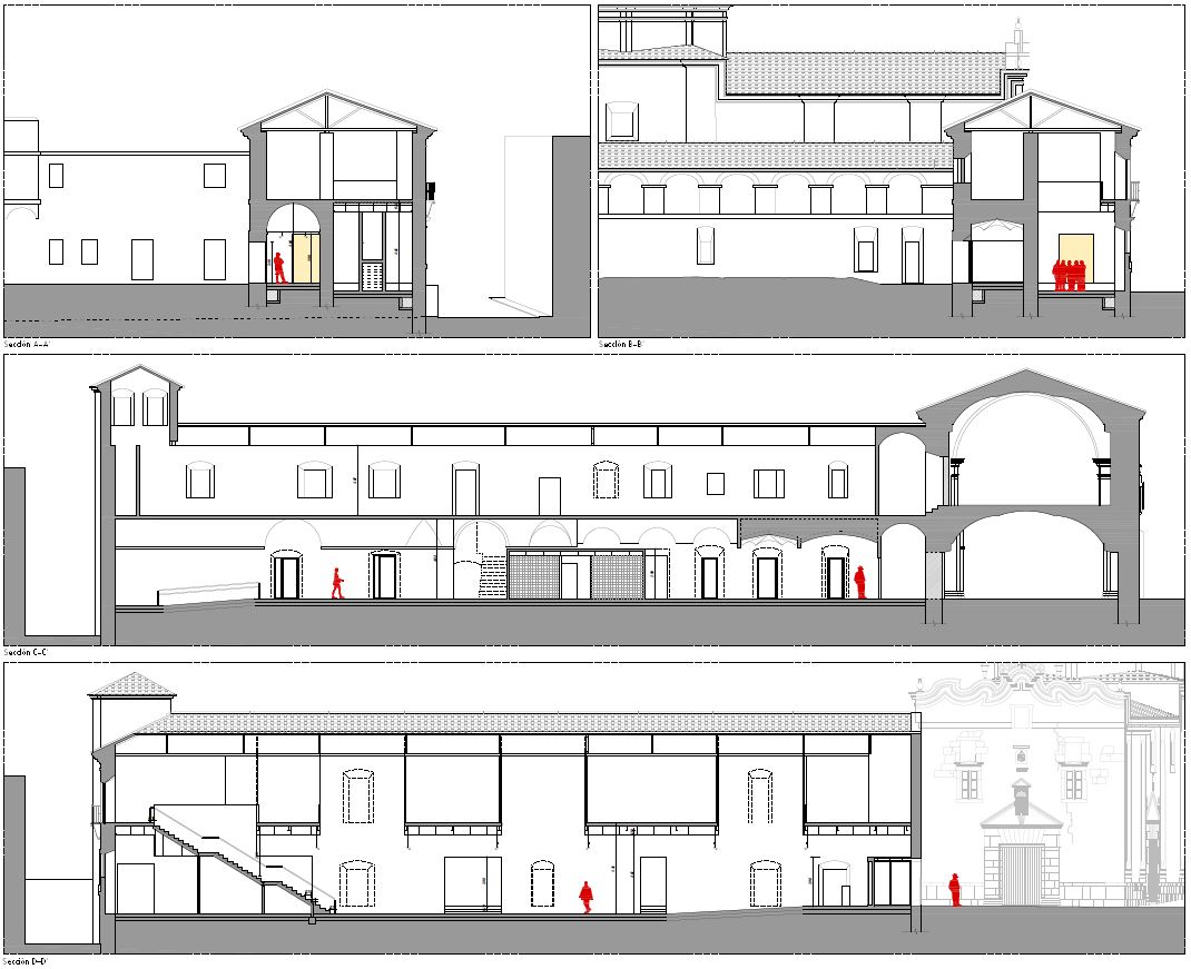 En la propuesta presentada por nosotros, y que resultaría ganadora, el hilo principal para su nuevo uso como Centro Cultural y Sala de Exposiciones, es el edificio en sí mismo y los elementos de gran valor arquitectónico existentes en su interior. De este modo, se proyectan una serie de espacios y circulaciones en las que son el propio edificio el que se expone, con la recuperación, entre otros, de sus bóvedas.