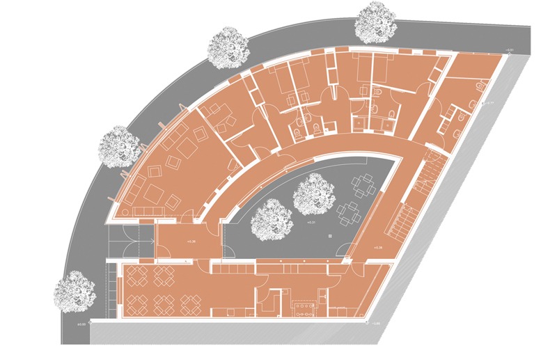Las habitaciones se han organizado en bloques de dos, que van adaptando su forma a la curvatura de la fachada. En la organización de los bloques de habitaciones se distinguen tres zonas: una banda al exterior con las habitaciones, una intermedia con los núcleos de aseo compartidos y una banda de circulación que, tangente a todos, rodea el patio.