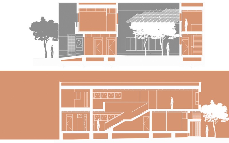 La Casa-Hogar se estructura según el esquema de una casa-patio, recogiendo la tradición tipológica de la vivienda en las poblaciones del bajo Guadalquivir. El acceso se realiza a través de una hendidura en la planta baja, consiguiendo permeabilidad visual entre la calle y el patio central soleado, en torno al cual se articula la vida en la casa-hogar, permitiendo su uso como segundo salón de la casa y la realización de actividades al aire libre.