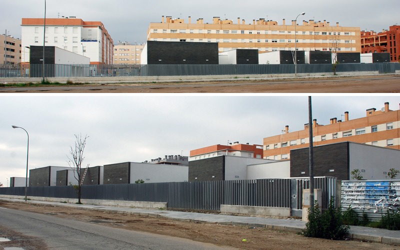 Entre la Zona Deportiva y el Centro Social se dispone un aparcamiento para vehículos, y entre el Centro Social y la Casa-Hogar se sitúan jardines destinados a huertos para uso y disfrute de los residentes.