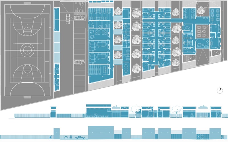• El primer volumen alberga los usos más públicos: comedor, centro social, talleres y salón de actos.