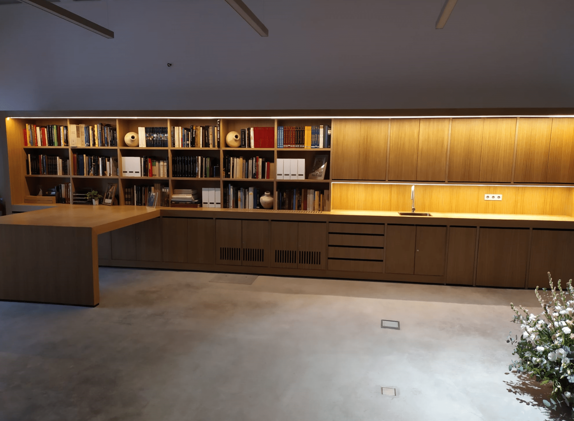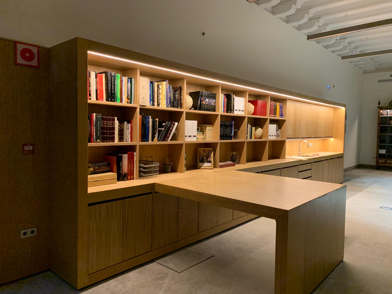 reorganizar la estancia de manera diáfana, con zona de trabajo cercana al acceso y zona de almacenamiento más al fondo, con posibilidad de realizar proyecciones o clases.